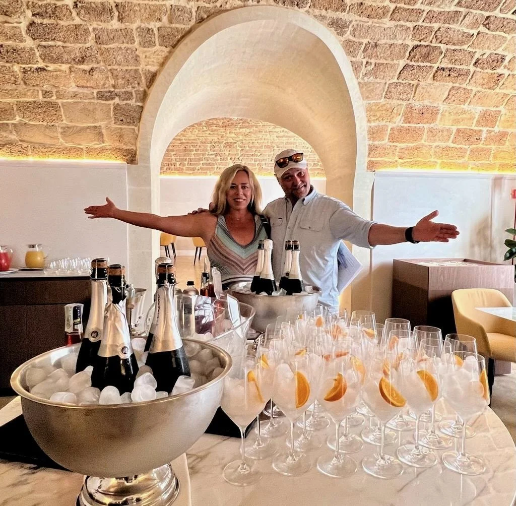 Co-founders of Dressler Detours Taunya & Christoph Dressler welcoming travelers to a reception with aperol spritz in a medieval reception room in Sicily.