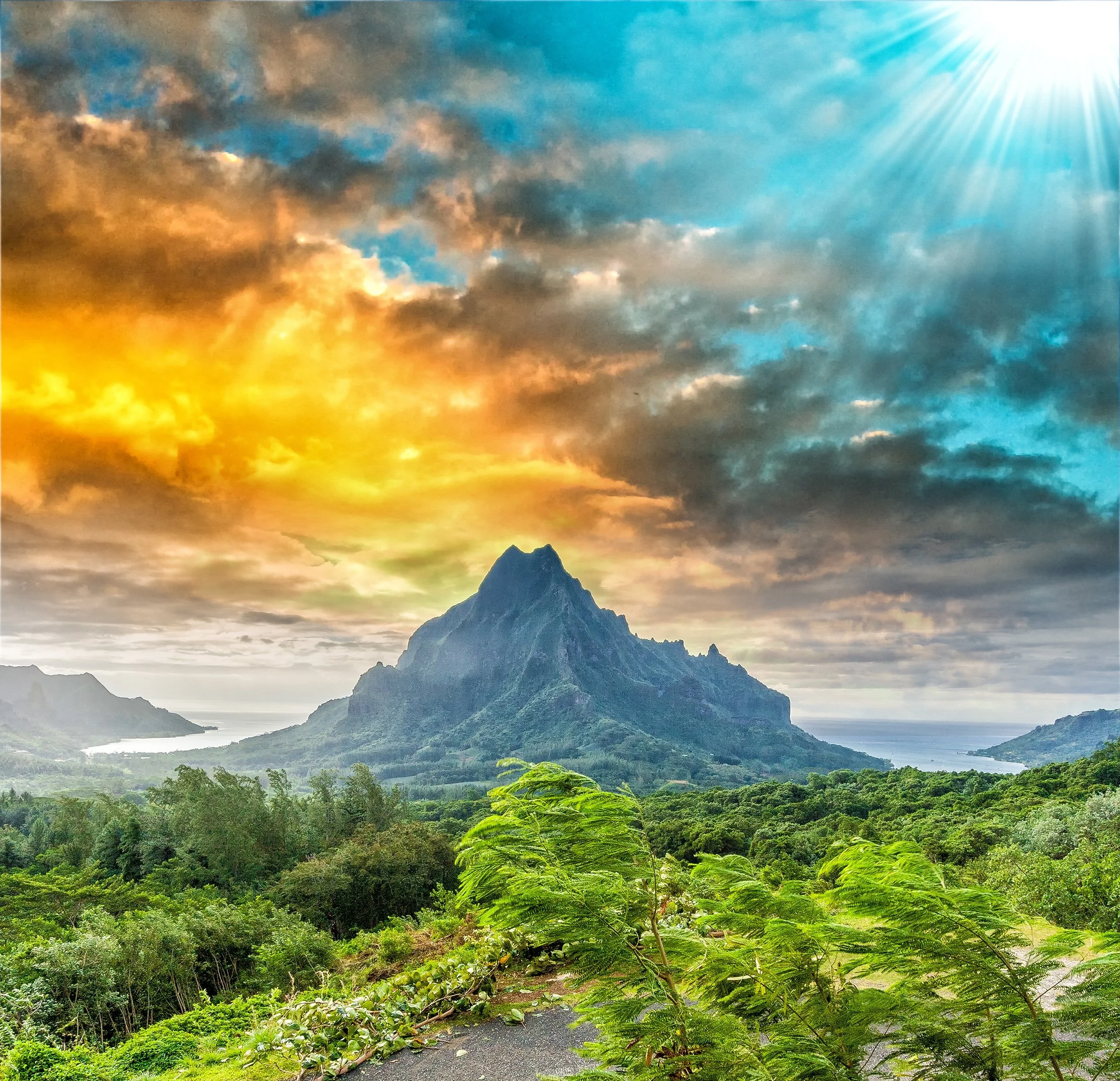 • Rugged mountain on Moorea island with ocean and sunset lighting up the clouds