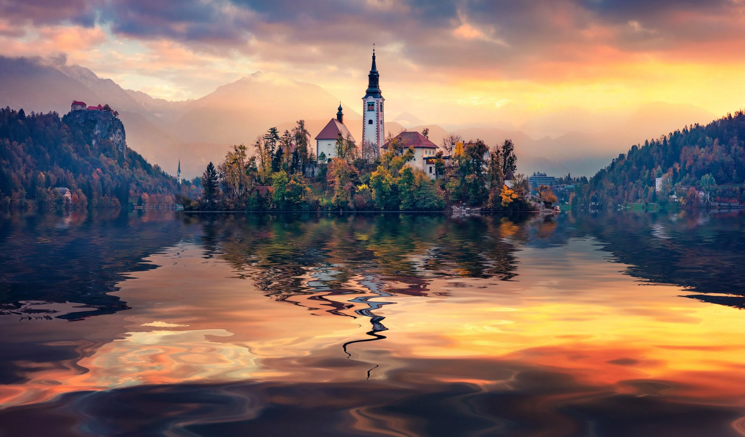 • Bled island with castle reflecting on calm waters of Lake Bled at sunset in Slovenia