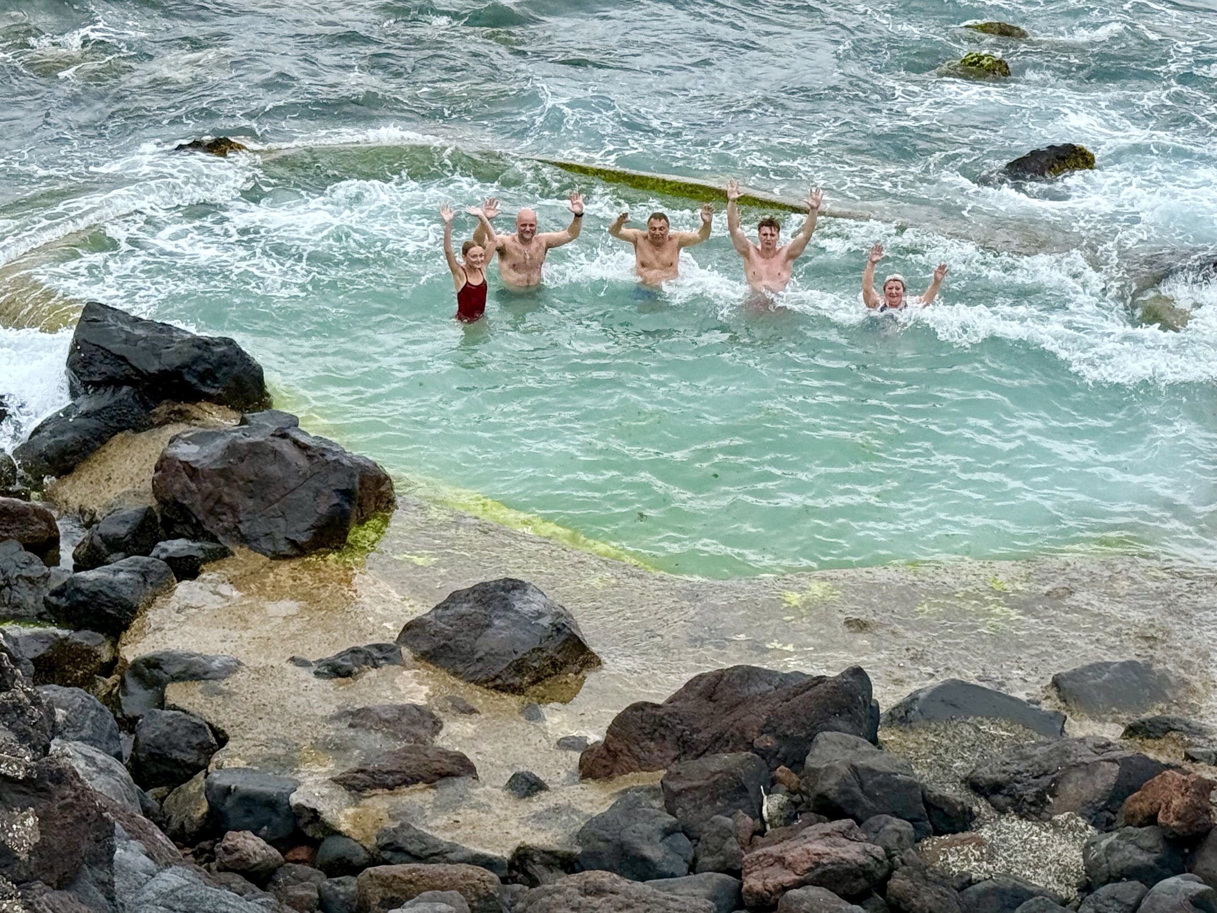 Four people swimming in a natural hot spring or pool near a rocky shoreline with foam and waves in the background.