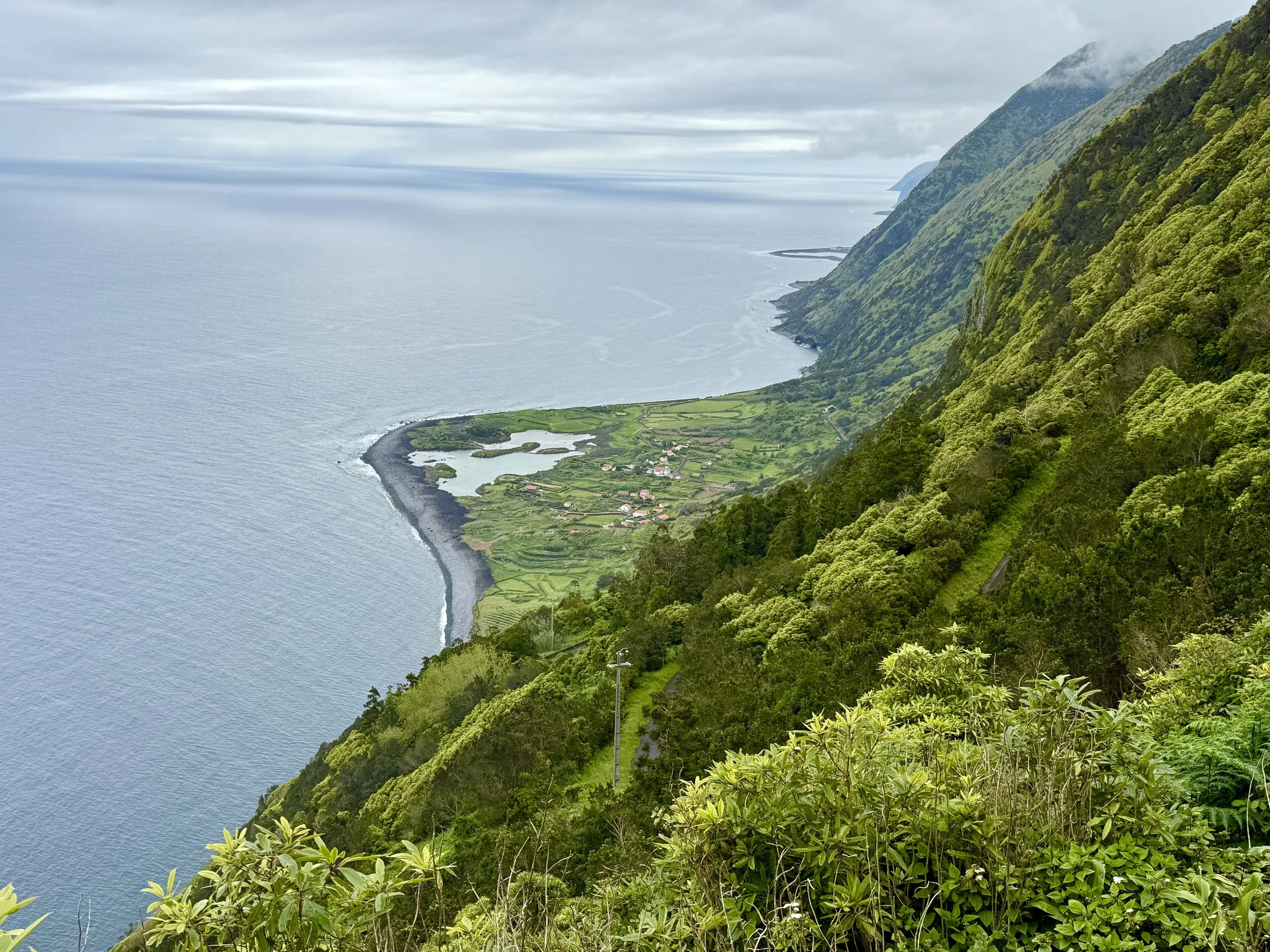 One of our favorite hikes of the trip started at Serra do Topo, where the trail descends steeply down to Fajã da Caldeira de Santo Cristo, famous for its rare clams. The route hugs the cliffside through lush forest and opens to sweeping ocean views, before arriving at the fajã itself—isolated, soulful, and unreachable by car. We continued on to Fajã dos Cubres, following a peaceful trail between wetlands and hydrangea hedges.